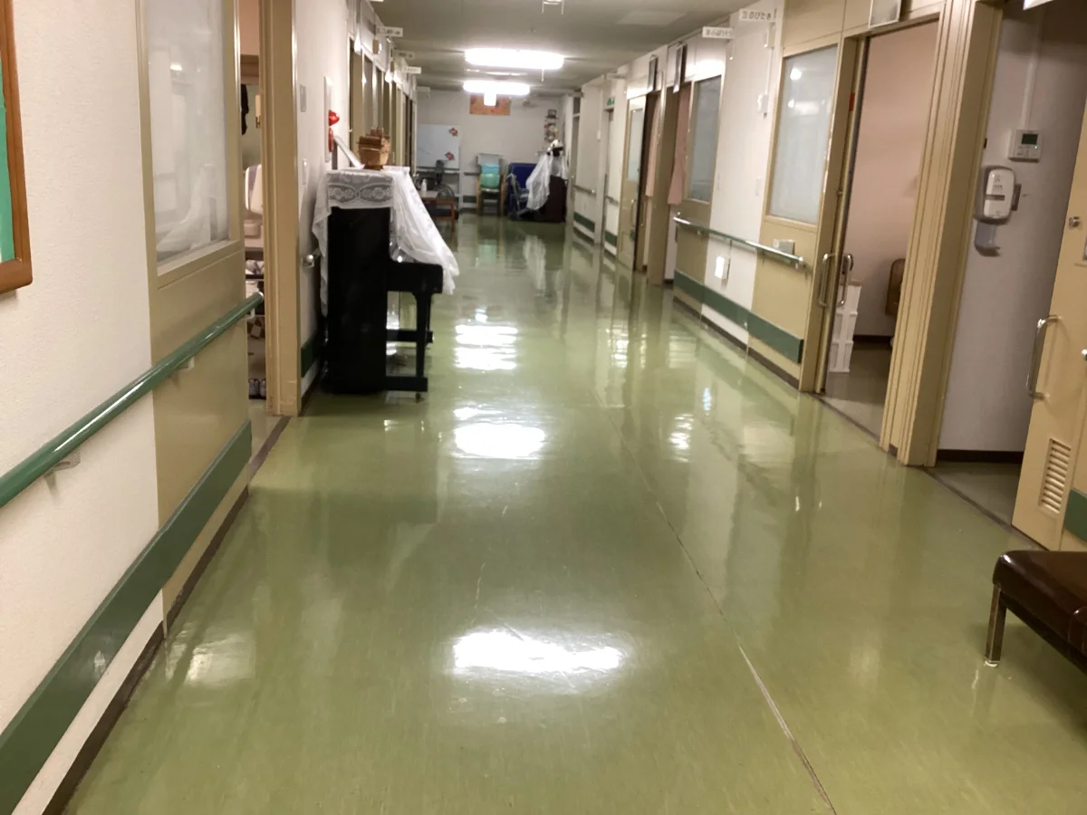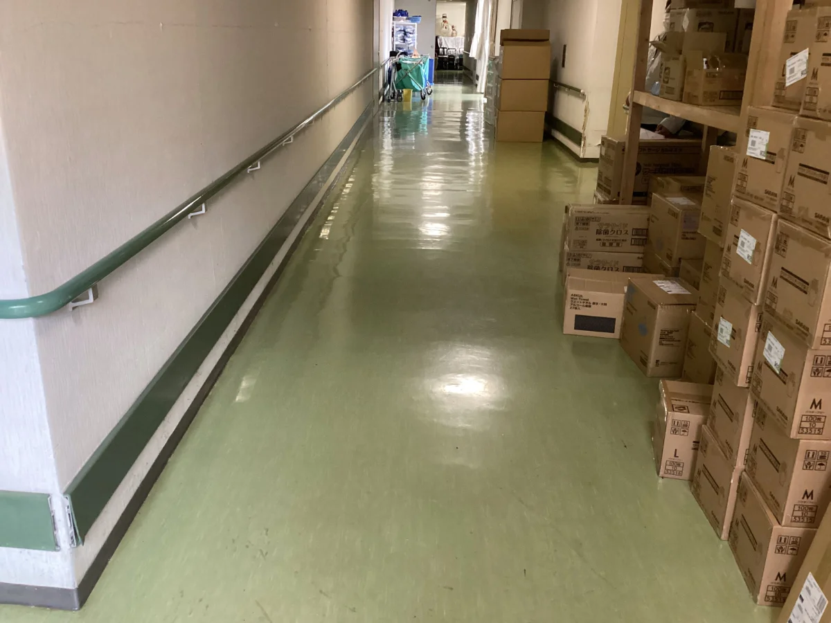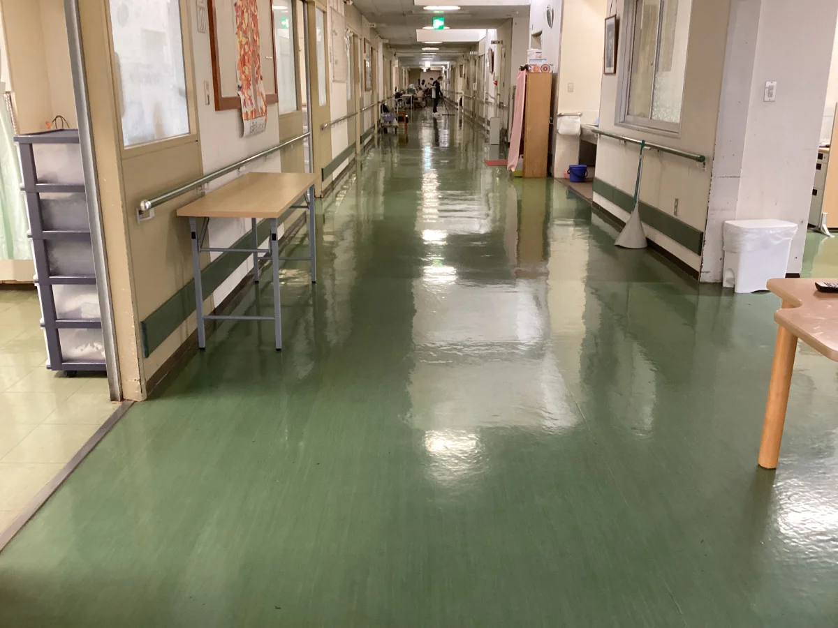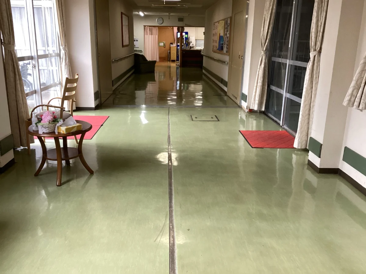 熊本市北区にある、特別養護老人ホームT様の廊下床長尺シート張替工事を行いました。