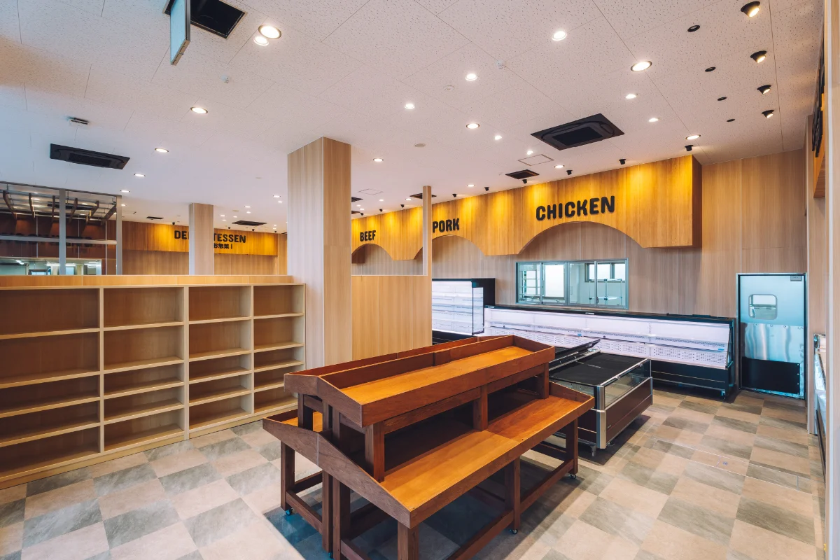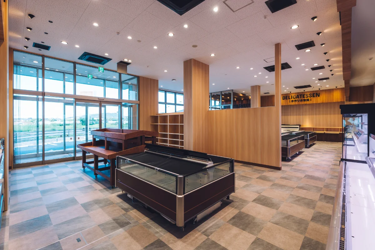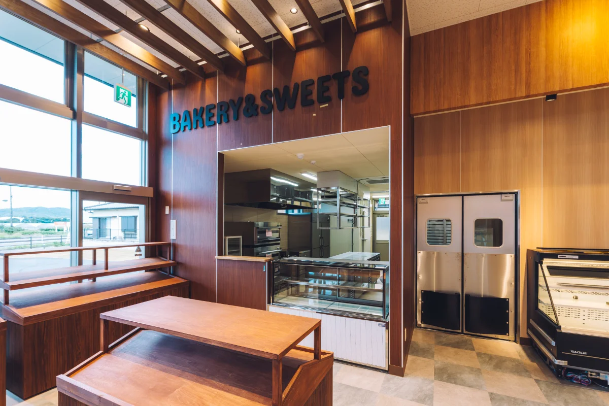 ベーカリー&スイーツコーナーは、あえて暗めの内装にすることで商品そのものが引き立つように工夫しています。