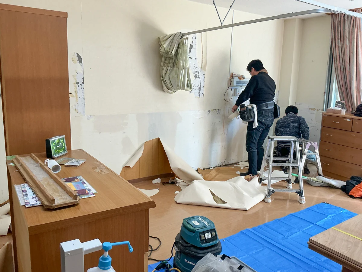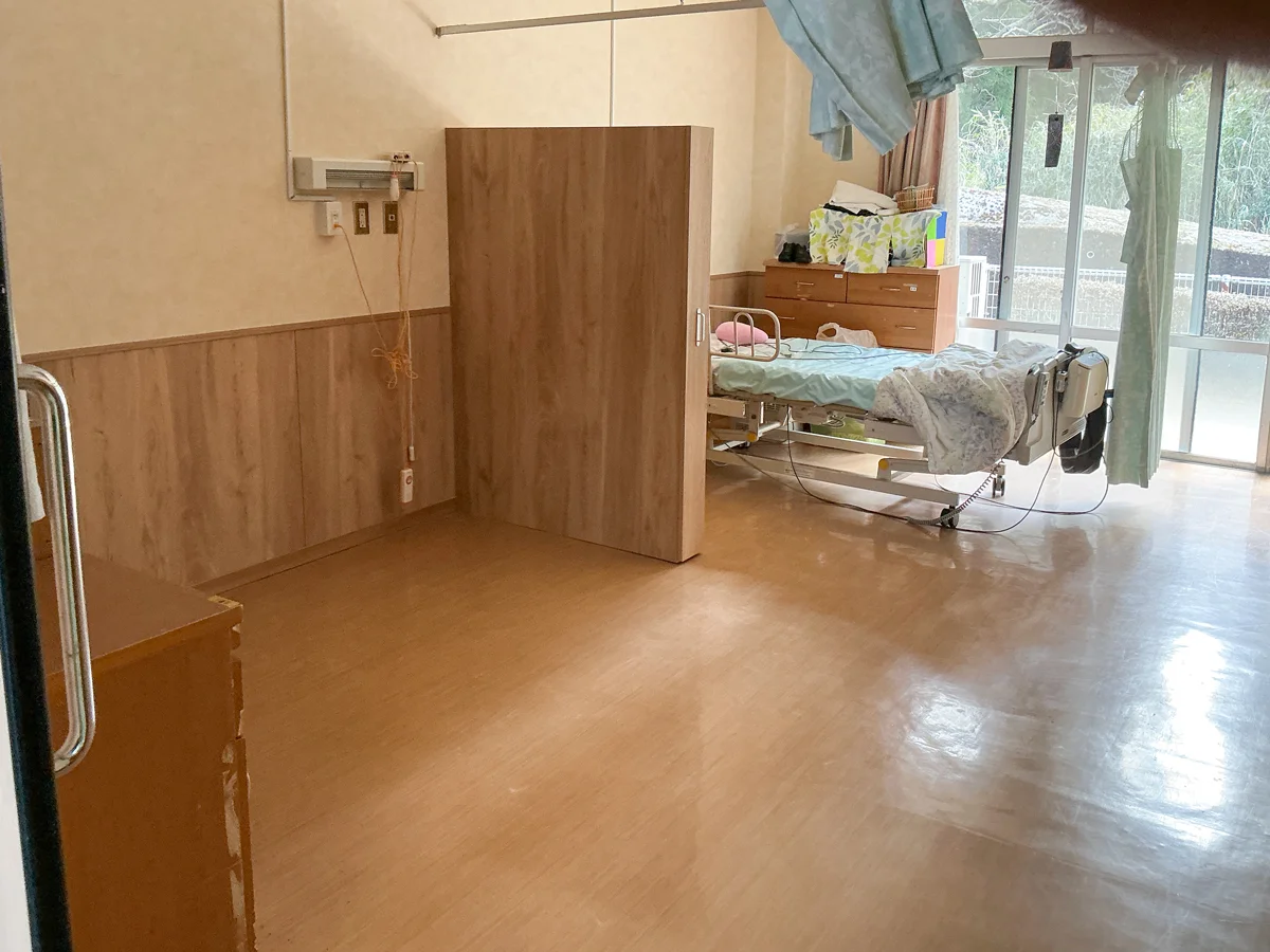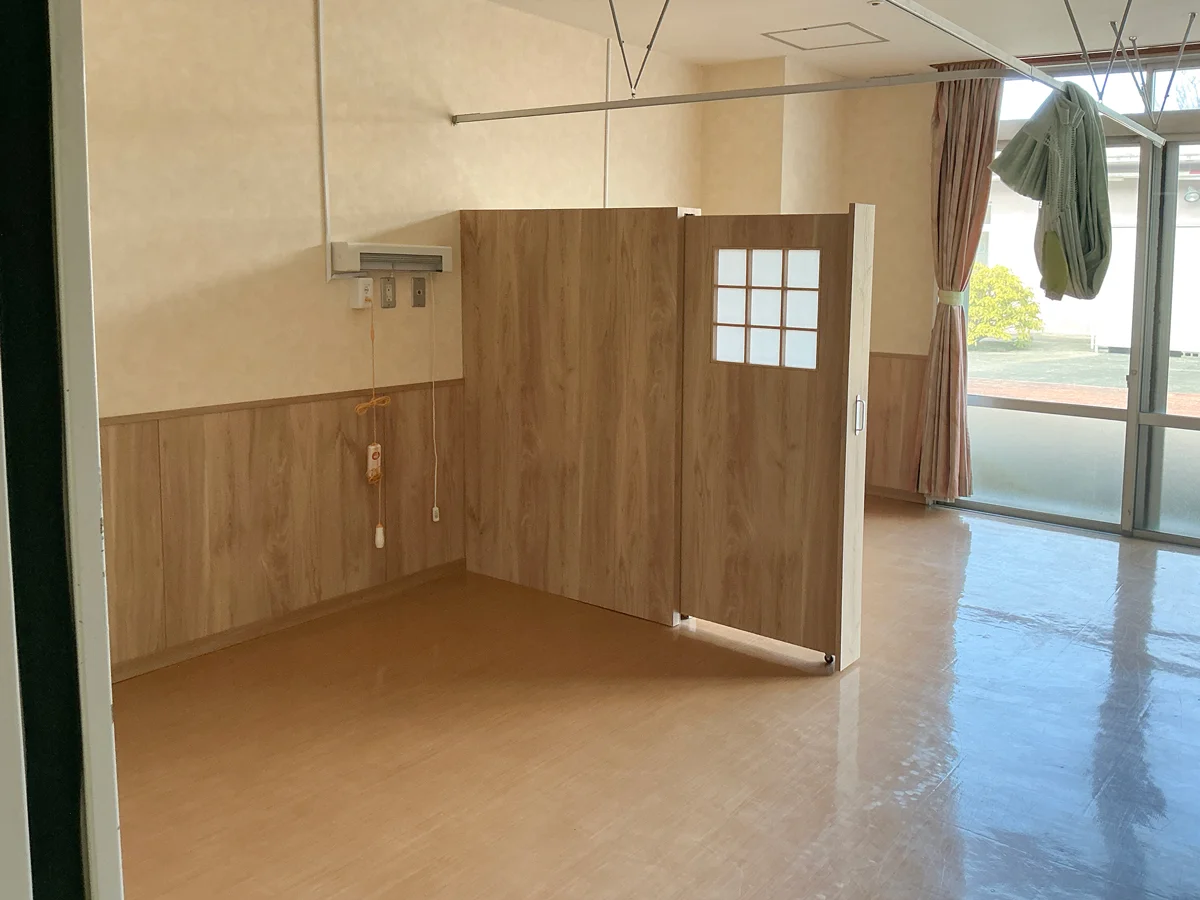 今回の工事では、入居者様お一人おひとりの時間をより大切にできるよう、居室内に間仕切りを新設。プライバシーに配慮した、落ち着きのある空間づくりを実現しています。